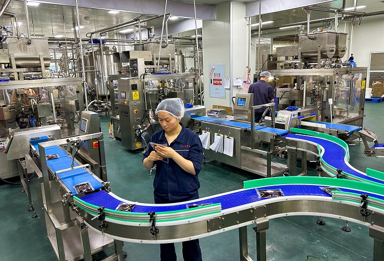 图为食品生产车间,工人们正在生产线忙碌。