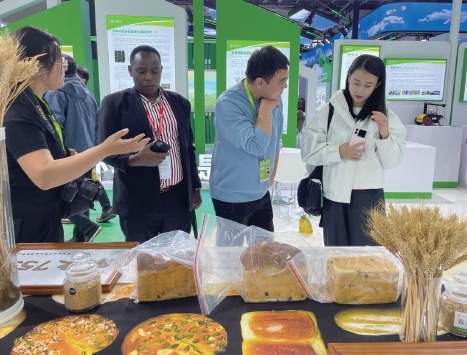 中国农业大学展区工作人员在向国内外参展观众介绍优质超强筋小麦新品种“农大753”。农民日报·中国农网见习记者 丁伶俐 摄