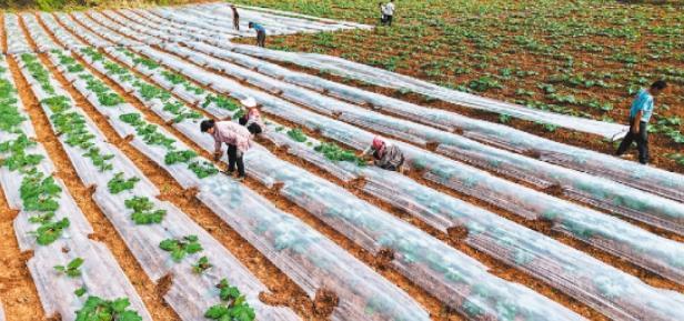 10月6日,云南省红河哈尼族彝族自治州弥勒市巡检司镇龙树村,农民在西葫芦种植田间覆膜打孔,加强田管。10月8日是寒露节气,该时节是秋收秋种秋管的大忙时节。普佳勇摄(中经视觉)