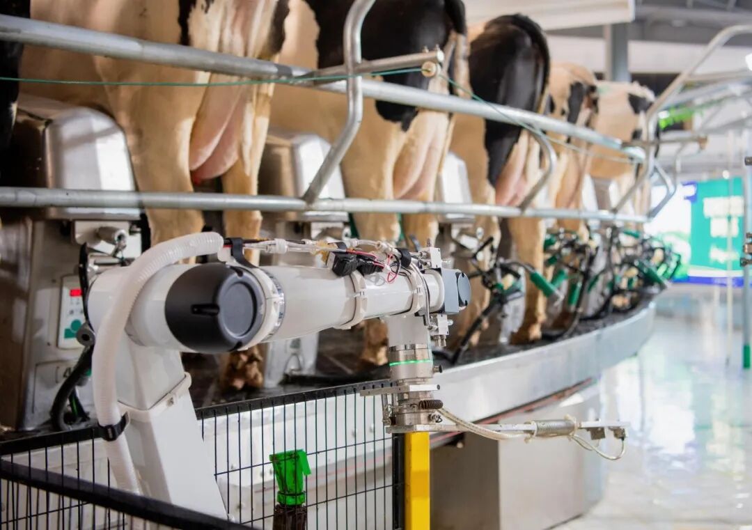 奶厅自动化作实现了从挤奶到清洗的全流程数据化、自动化控制,为牛奶提质、效率提升、风险预警提供核心支撑。同时,配备机械药浴臂、奶量计量、分群门等系统,实现无人化清洗和精准药浴,挤奶后自动分流奶牛,效率提升50%以上,让霜降时节的挤奶生产既高效又安心。