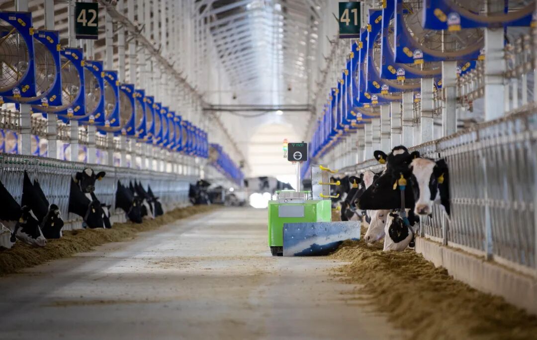 智能无人作业覆盖饲料加工、输送、推料环节,超大型中央厨房可为3.6万头奶牛提供集中加工饲料,智能驾驶车辆输送日粮,推料机器人24小时工作,彻底释放重复劳动岗位。