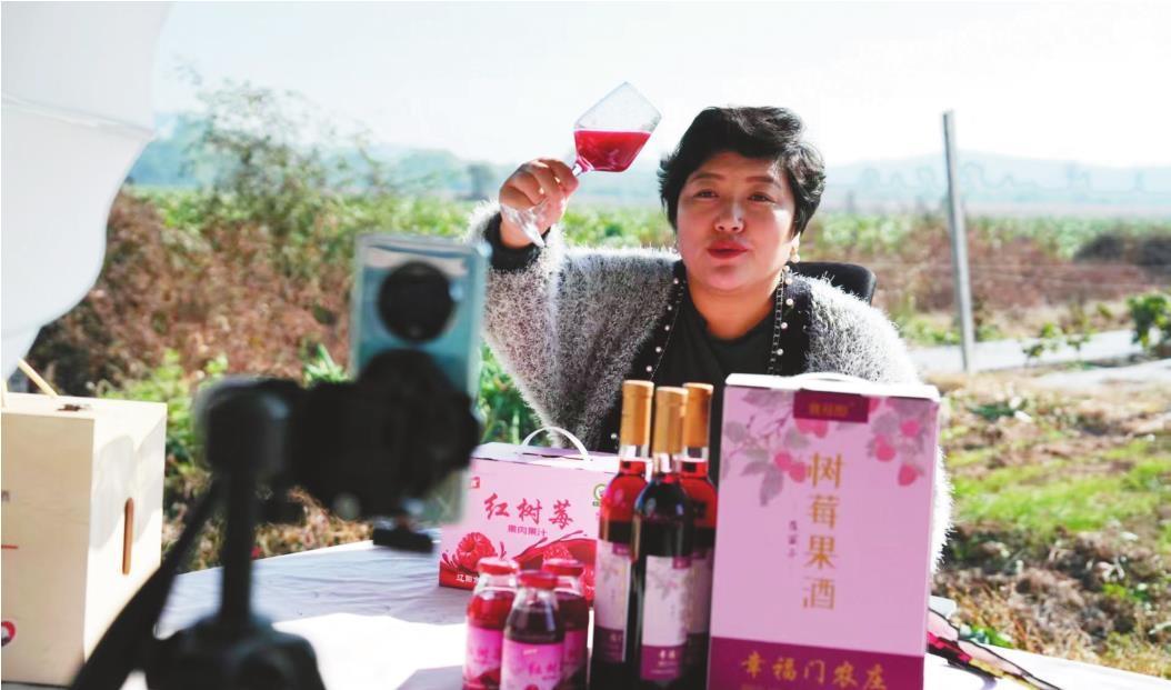幸福门农庄位于辽阳市太子河区东宁卫乡,有7栋大棚,栽种着树莓、黑莓等多种小浆果,园内还散养着400多只蛋鸡、十余头跑山猪和一群活泼的兔子。今年8月起,农庄主人刘英茹开始尝试直播卖货,农庄的树莓酒、树莓果汁等深加工产品销售额有了明显提升,观光采摘的人也多了,农庄更加热闹。“打包寄快递虽然累,但心里可是真美啊!”刘英茹兴奋地说,不久前的一场直播中,树莓果汁一下子卖出了 97 单,整整 134 箱。