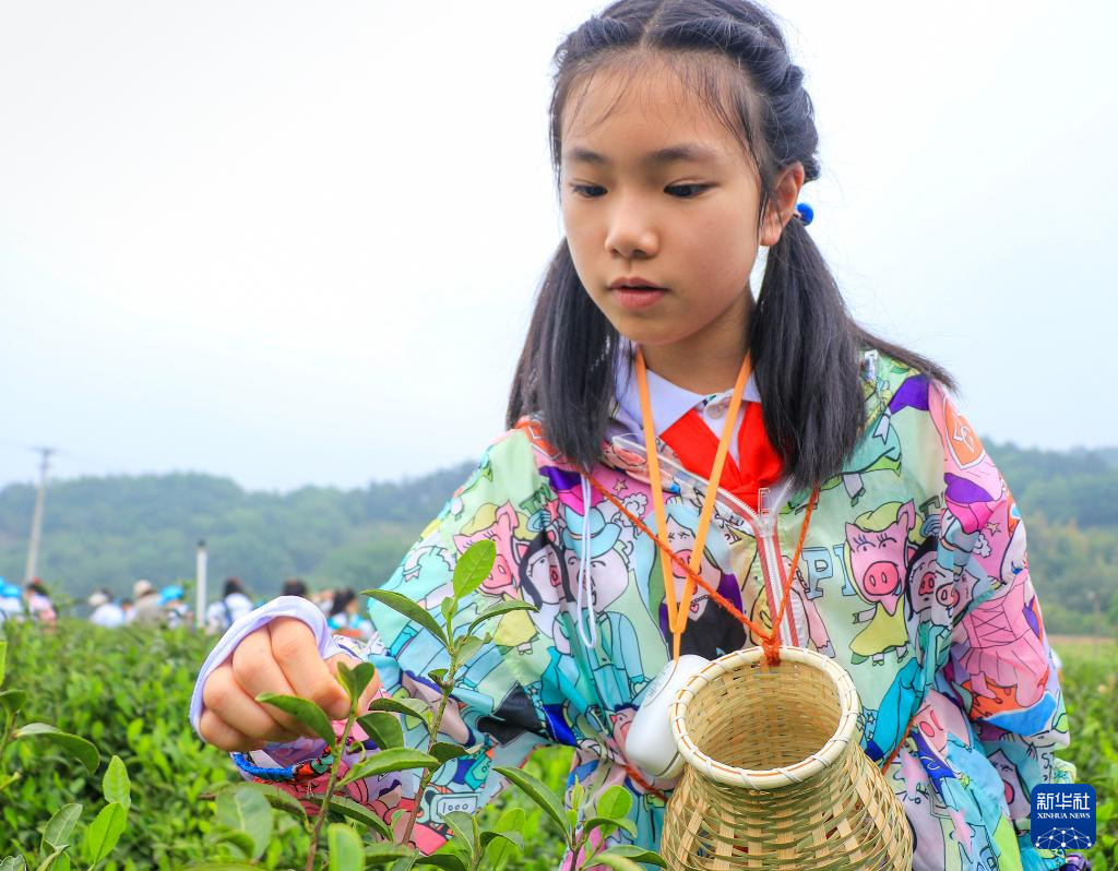 2023年4月19日,在安徽省合肥市庐江县汤池镇一处茶园,小学生在体验春茶采摘。新华社发(李红兵 摄)