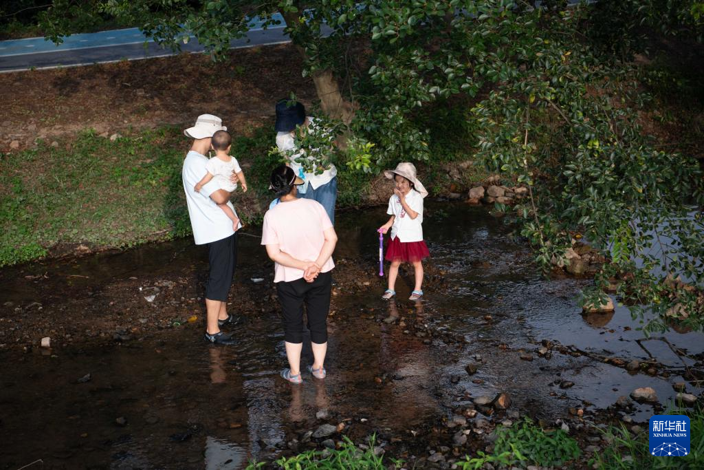 2025年7月26日,游客在安徽省合肥市庐江县长冲村的小溪里戏水。新华社记者 张端 摄