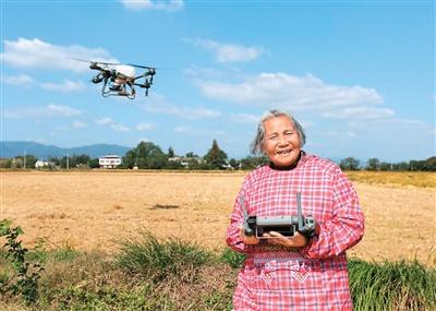 奶奶年轻时读过私塾,识字,理解能力强,身子骨也硬朗,虽然年纪大了不下地,但闲不住,在家里打理了一块小菜园,养了小鸡小鸭。她对新事物充满好奇,每次我操作智能农机,她总在旁边看,想学,我就给她一遍遍演示讲解。奶奶觉得,无人机“最好耍”,在屏幕上轻巧地操作几下,“这么大点儿的小飞机就能满田飞”。时间一长,她逐渐掌握了无人机的操作方法,但出于安全考虑,我们只在农忙时让她搭把手,也总是在旁边指导看护。她总是乐呵呵地说:“现在变化大了!犁田不用牛,打药不用背,割稻不用刀,真好!”