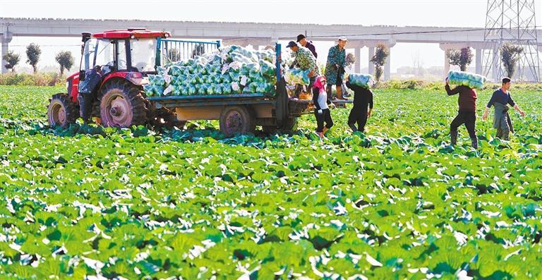 11月28日,咸宁市嘉鱼县潘家湾镇农民在田间搬运蔬菜。蔬菜产业的蓬勃发展,带动全县农民实现就业增收,直接参与经营或务工的农民达7.5万人,人均年创收约1.7万元。