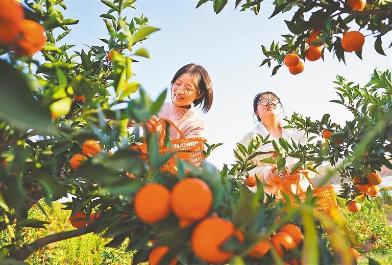 11月27日,咸宁市咸安区向阳湖镇广东畈村上屋朱田园综合体,游客在采摘糖桔。当地依托特色农业资源,打造多元化采摘体验,将田园风光转化为经济效益。
