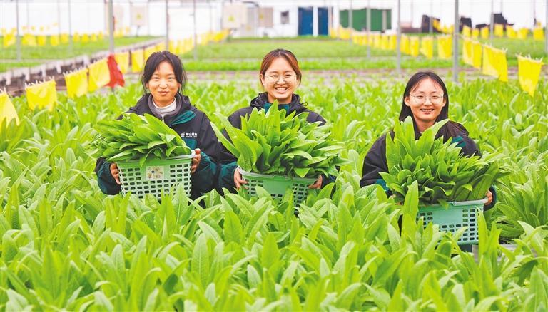 12月4日,四川省遂宁市安居区聚贤镇蔬菜大棚,工作人员在采摘油麦菜。当地采用潮汐式苗盘无土栽培,让蔬菜产量更稳定。 张勤宝摄 (中经视觉)