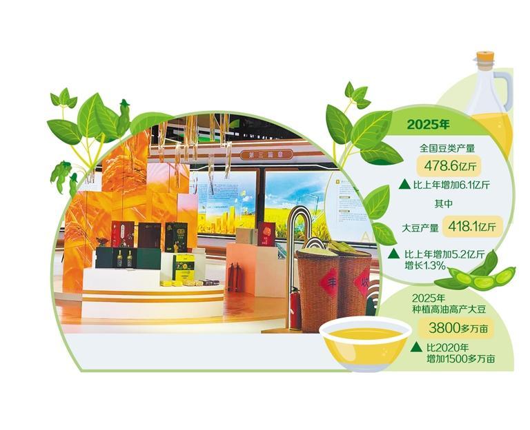 近年来,农业农村部门深入推进高油高产大豆“十百千”行动,加力推广高油、高蛋白大豆品种,持续优化品种结构。据农情调度,2025年种植高油高产大豆3800多万亩,比2020年增加1500多万亩。“脉育511”“牡豆47克”“菏育6号”“黑农531”等高油高产耐盐碱新品种,油分含量均达22%以上。海伦大豆、黑河大豆、克山大豆、湖南新田大豆等地方特色优良品种同台竞技……在博览会上,各类大豆品种集体亮相。