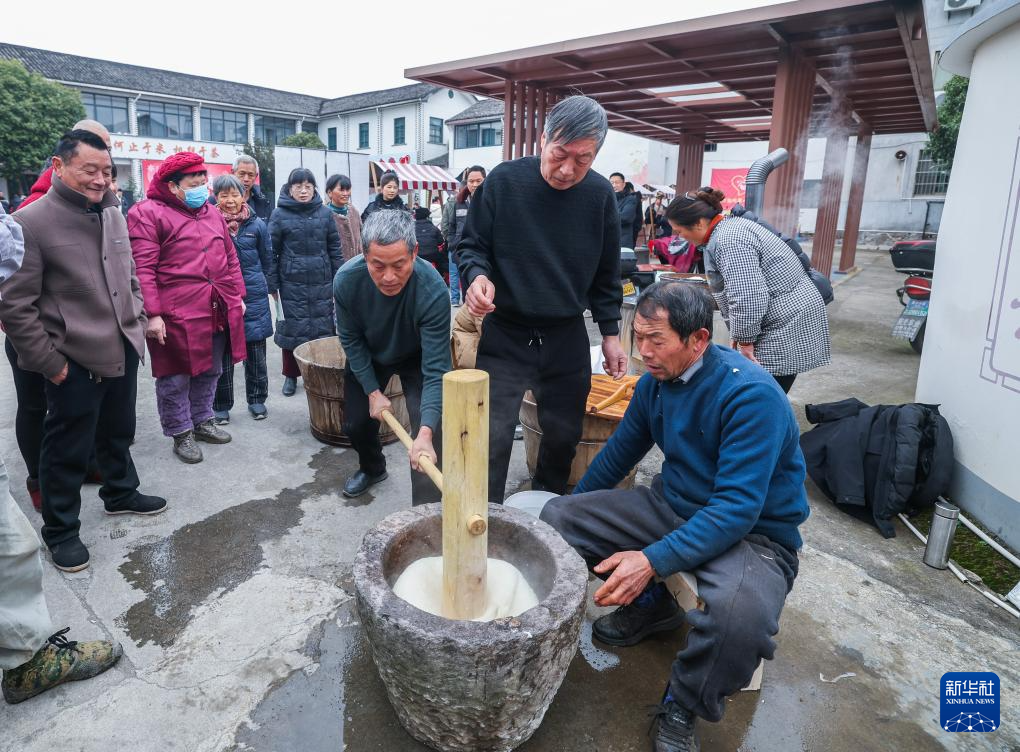 1月23日,村民们在东白湖镇乡村年味大集现场打麻糍。新华社记者 徐昱 摄