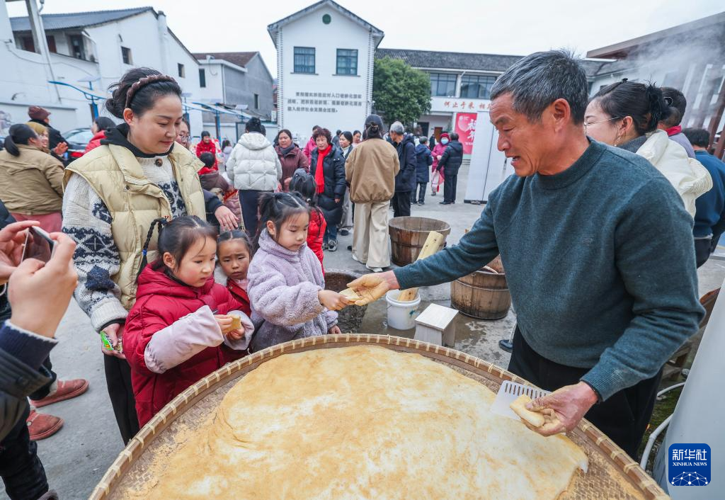 1月23日,孩子们在东白湖镇乡村年味大集上品尝刚刚做好的麻糍。新华社记者 徐昱 摄