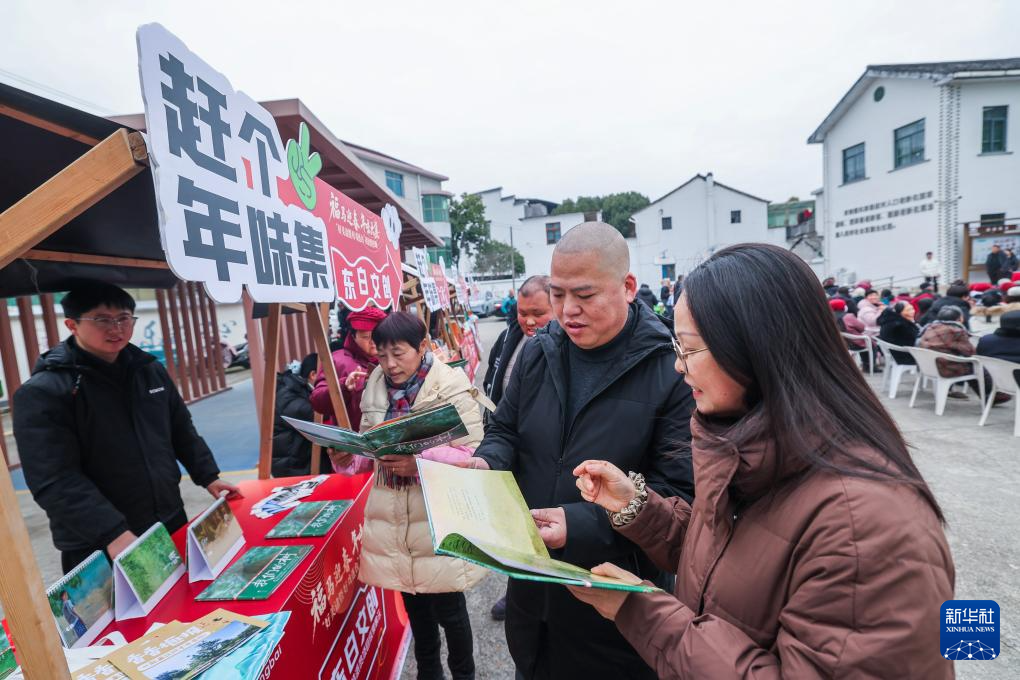 1月23日,村民在东白湖镇乡村年味大集现场的特色集市上翻看介绍当地人文环境的画册。 新华社记者 徐昱 摄