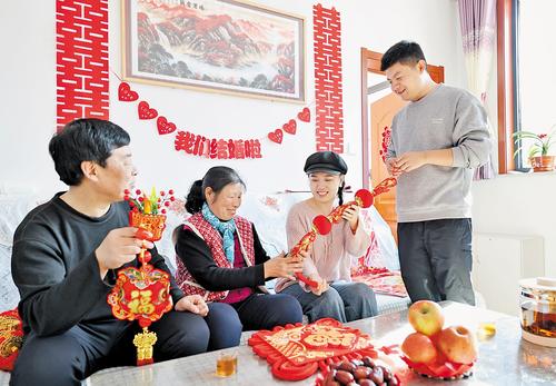 1月31日,吕晓哲(右一)、王亚(右二)为家里精心准备了年节饰品。 本报记者 赵海江摄