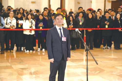 3月4日,全国政协十四届四次会议首场“委员通道”集体采访活动在北京人民大会堂举行。 新华社记者 曹祎铭 摄