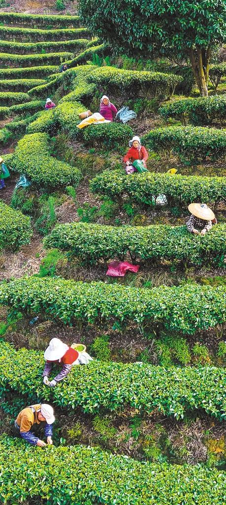 ▶3月11日,湖南省怀化市通道侗族自治县菁芜洲镇地连村九层岭茶场,茶农在采摘春茶。李尚引摄(中经视觉)