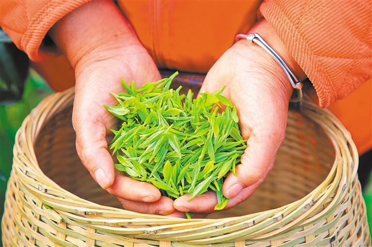 ◀3月22日,浙江省玉环市大麦屿街道石峰山火山茶基地,茶农展示新采的茶。段俊利摄(中经视觉)