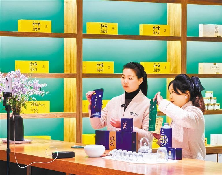 ▶3月20日,陕西省安康市紫阳县一茶叶公司,员工在展厅直播销售茶叶。储茂银摄(中经视觉)
