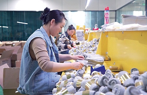 在集智纺织生产车间内,工人对织好的袜子进行分包。 麦吾兰江·莫明 摄