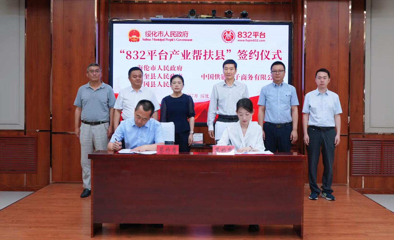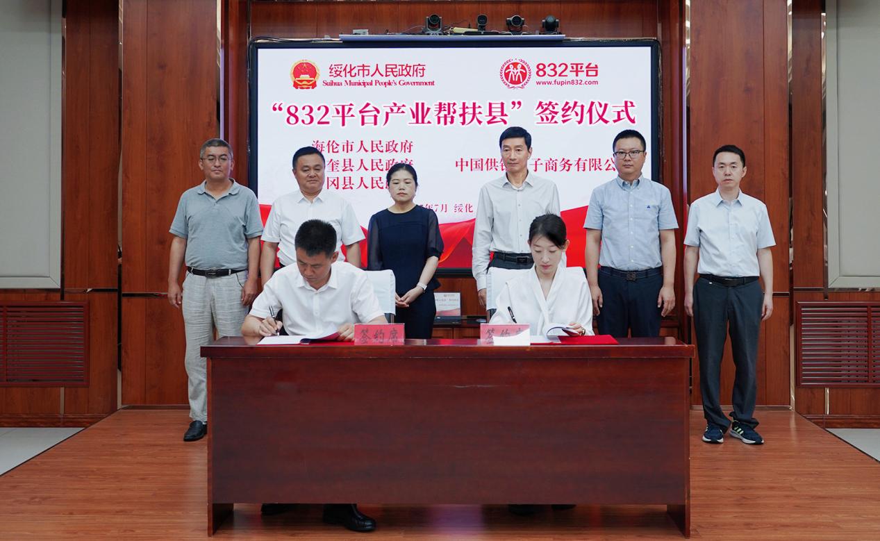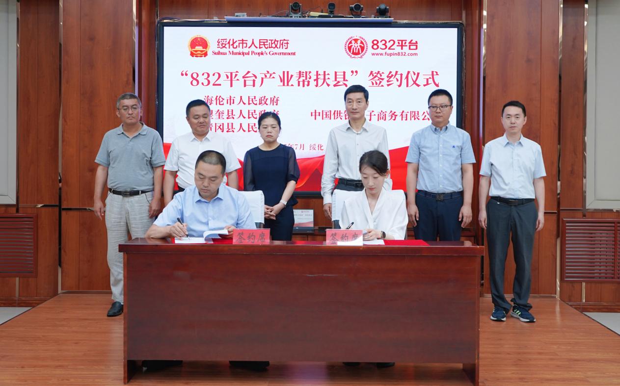 2025年7月,海伦市、望奎县和青冈县人民政府与“832平台”正式签署“产业帮扶县”战略合作协议,中国供销电子商务有限公司党委书记、董事长刘国生,绥化市委常委、副市长郭晓茹,市直相关部门及海伦市政府、望奎县政府、青冈县政府主要负责同志参加签约仪式。平台与各县(市)政府立足区域特色农业禀赋,聚焦“海伦大豆”“望奎好肉”“青冈友礼”区域公用品牌系列产品,以“平台+政府+龙头企业”的产业帮扶模式,在品牌培育、供应链优化、经营主体培育、物流配套等领域开展全链条深度合作,让开发式帮扶落地见效。