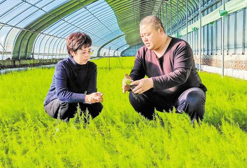 3月26日一大早,沽源县大石砬村党支部书记兼村委会主任孙喜玲来到百合花大棚里,仔细查看长势,和种植户商讨后期管理的注意事项。