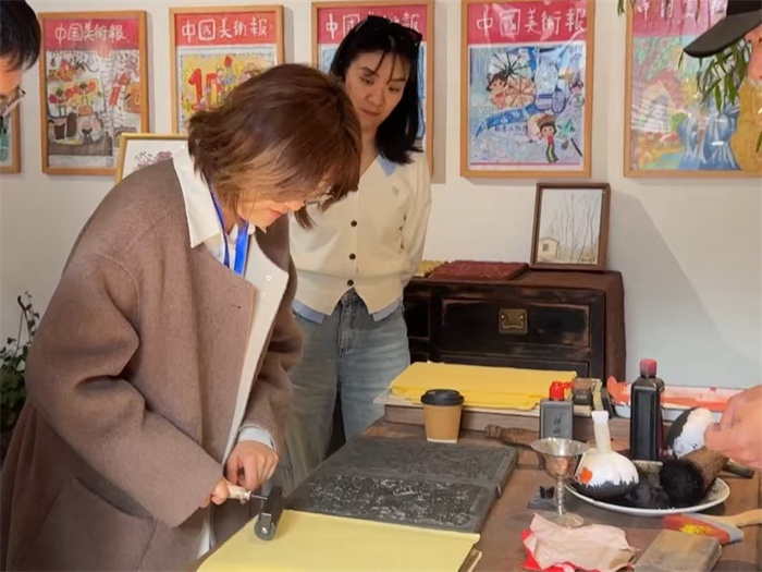 参会代表在王平镇韭园沟域·马致远元曲艺术街区体验非遗版画拓印