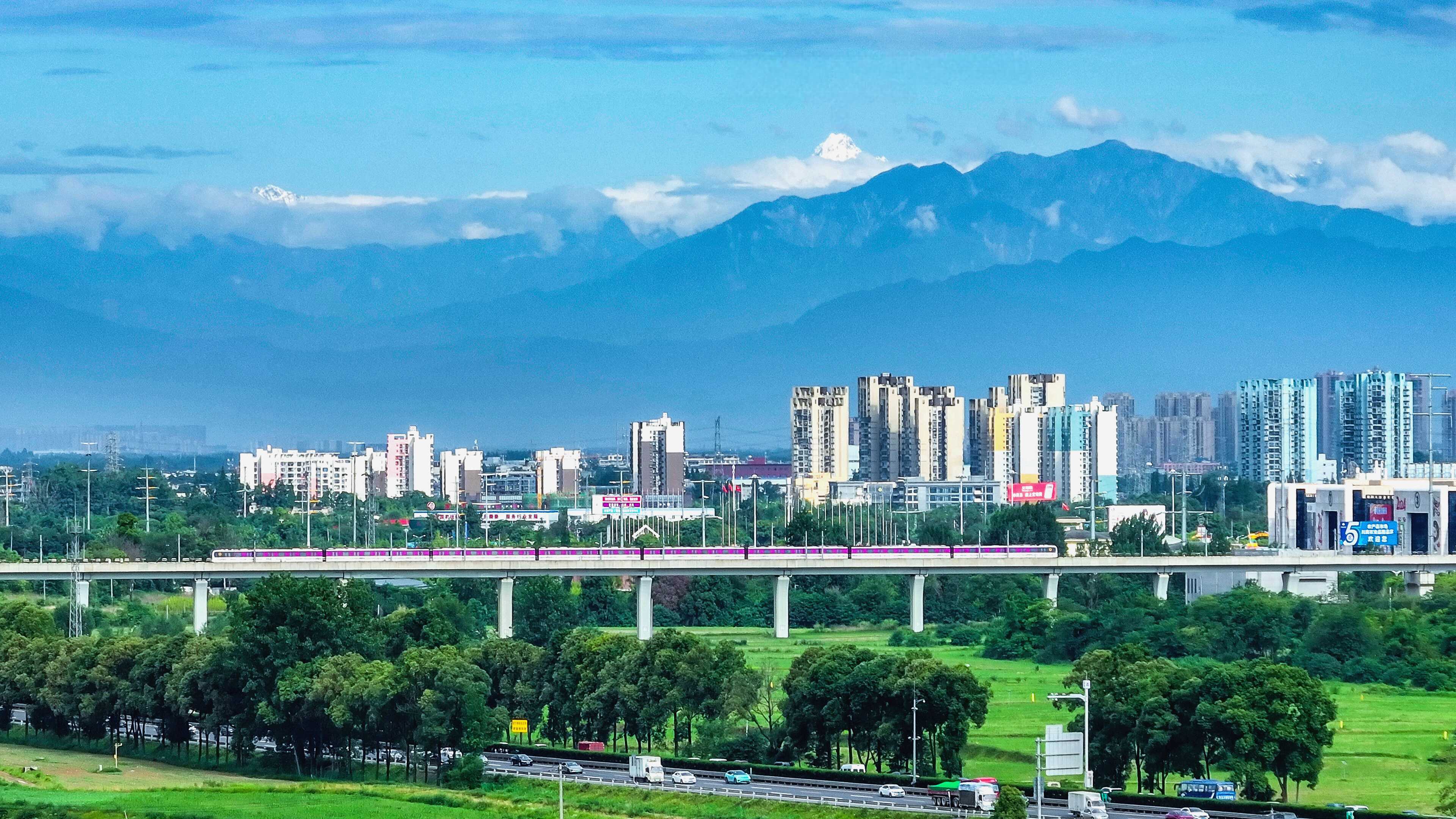 成都轨道交通5号线列车穿行于雪山下的公园城市