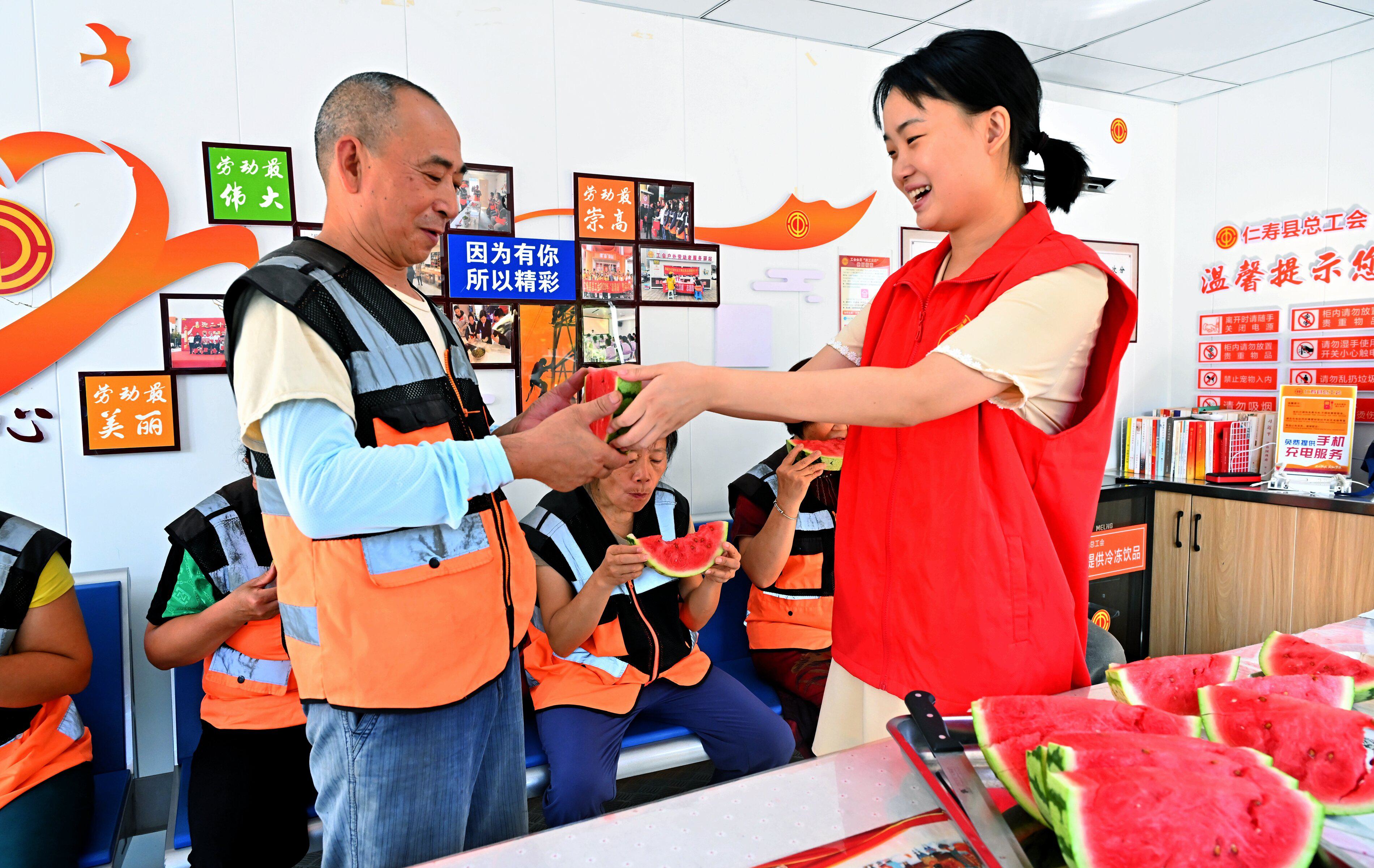 图为志愿者在工会驿站,为户外劳动者送西瓜。潘帅/摄影