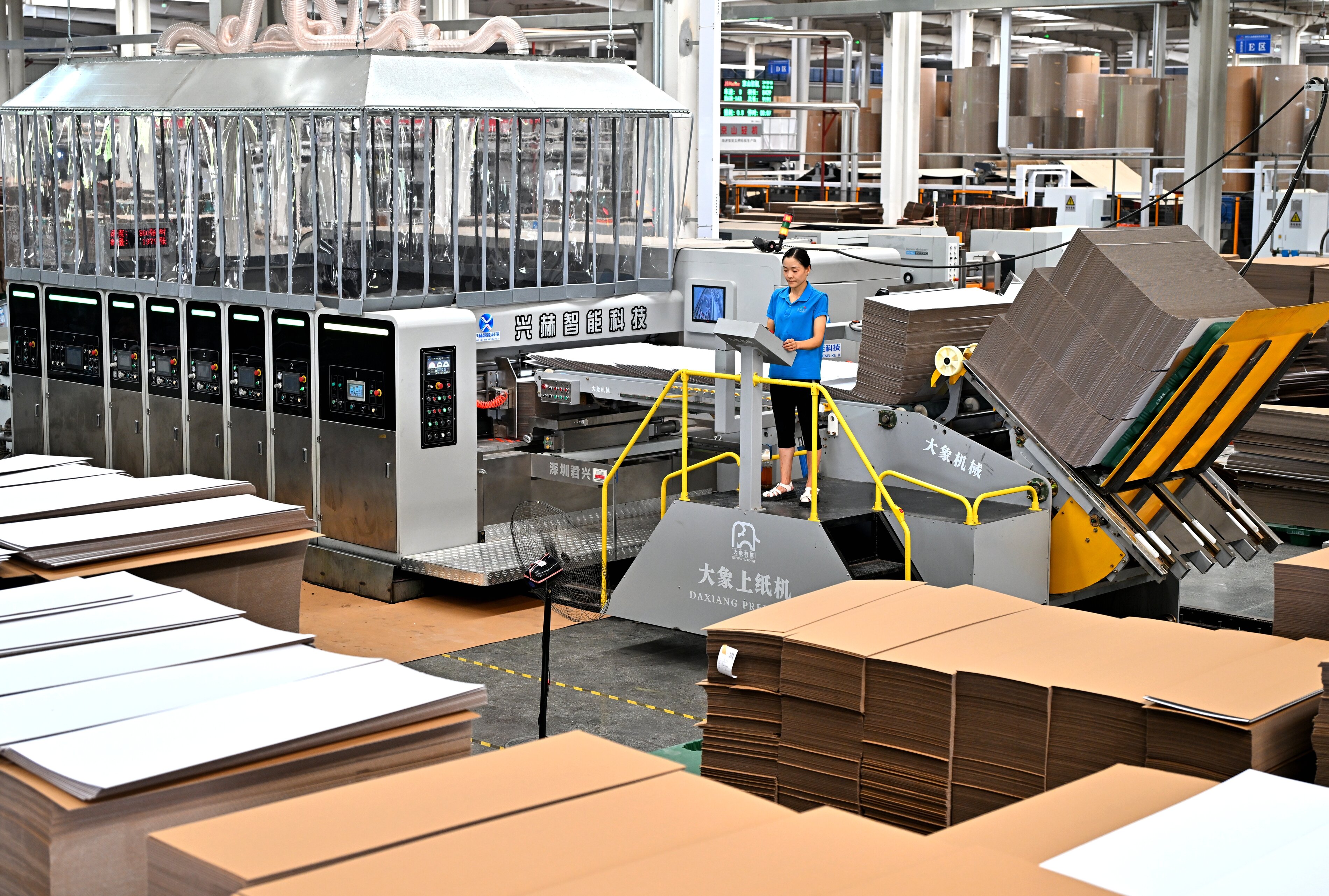 “车间的过道内安装有智能电子屏,实时呈现着生产订单、产品合格率、产量等各类数据以及生产设备的运行状况。车间内工人不多,他们的角色更像是流程的‘监护者’,清晰地掌握每一份订单的完成进度。这是传统包装行业一场‘静悄悄的革命’。”义远博瑞负责人介绍,作为2024年新建投产的企业,义远博瑞从诞生之初就带着“智造”的基因,关键工序100%数控化。