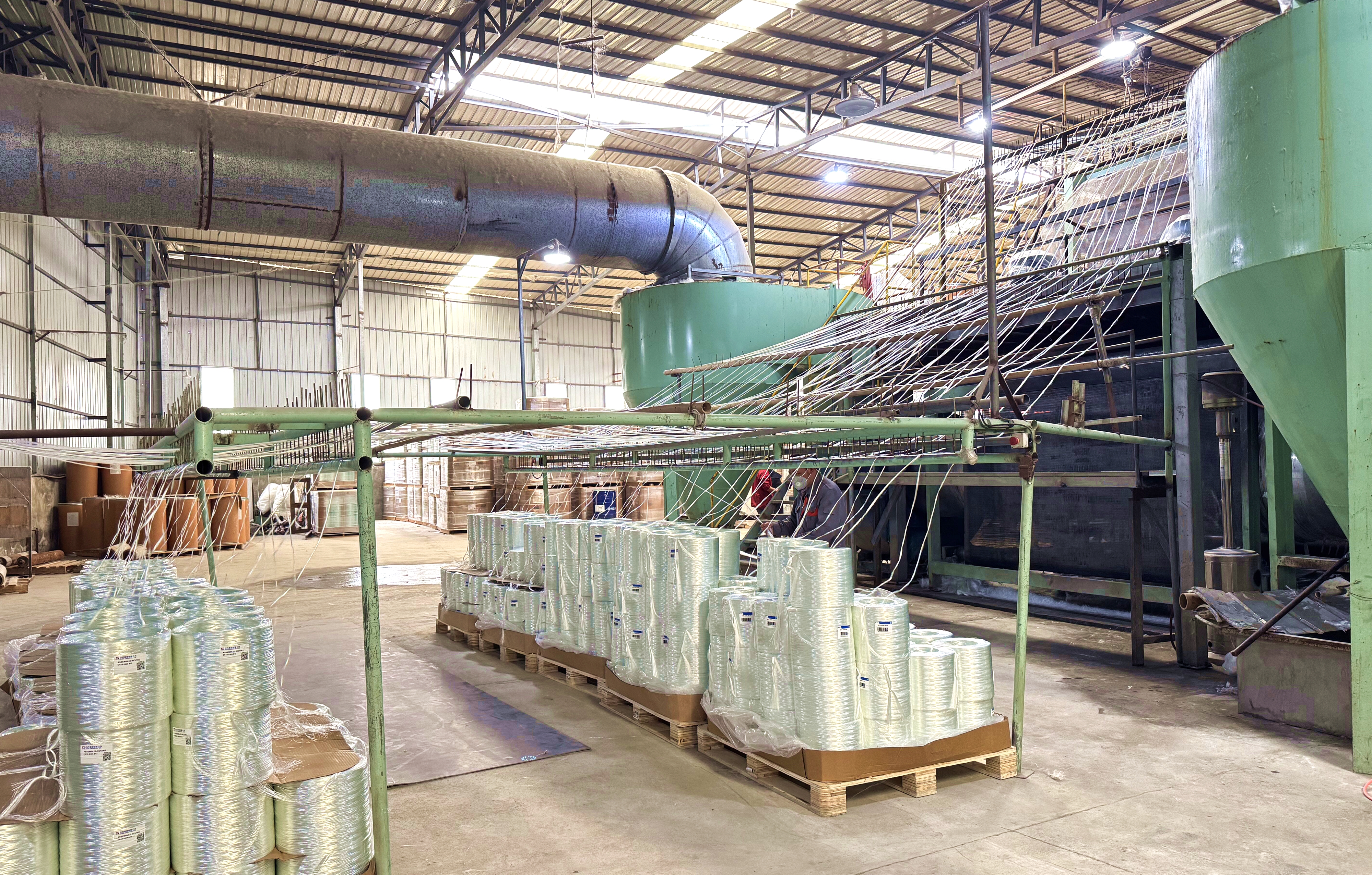 其生产车间内,LY3200高速生产线持续运转,一卷卷不同规格的玻纤短切毡经加工、收卷后整齐堆放,即将发往海外市场。